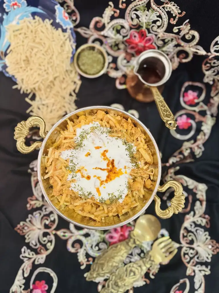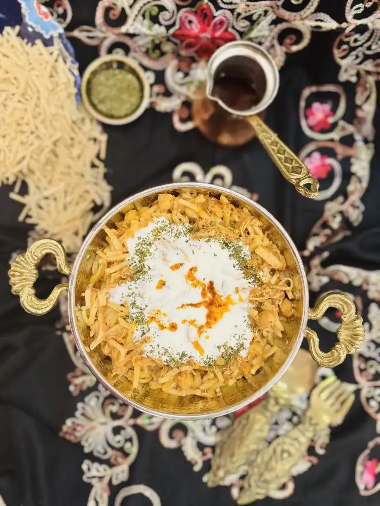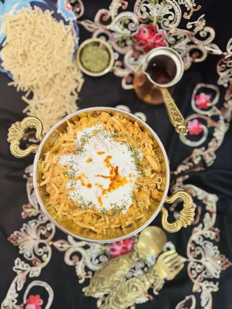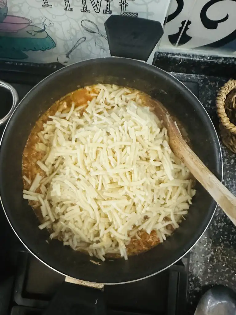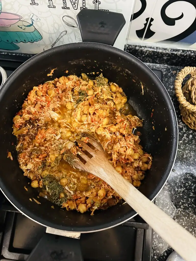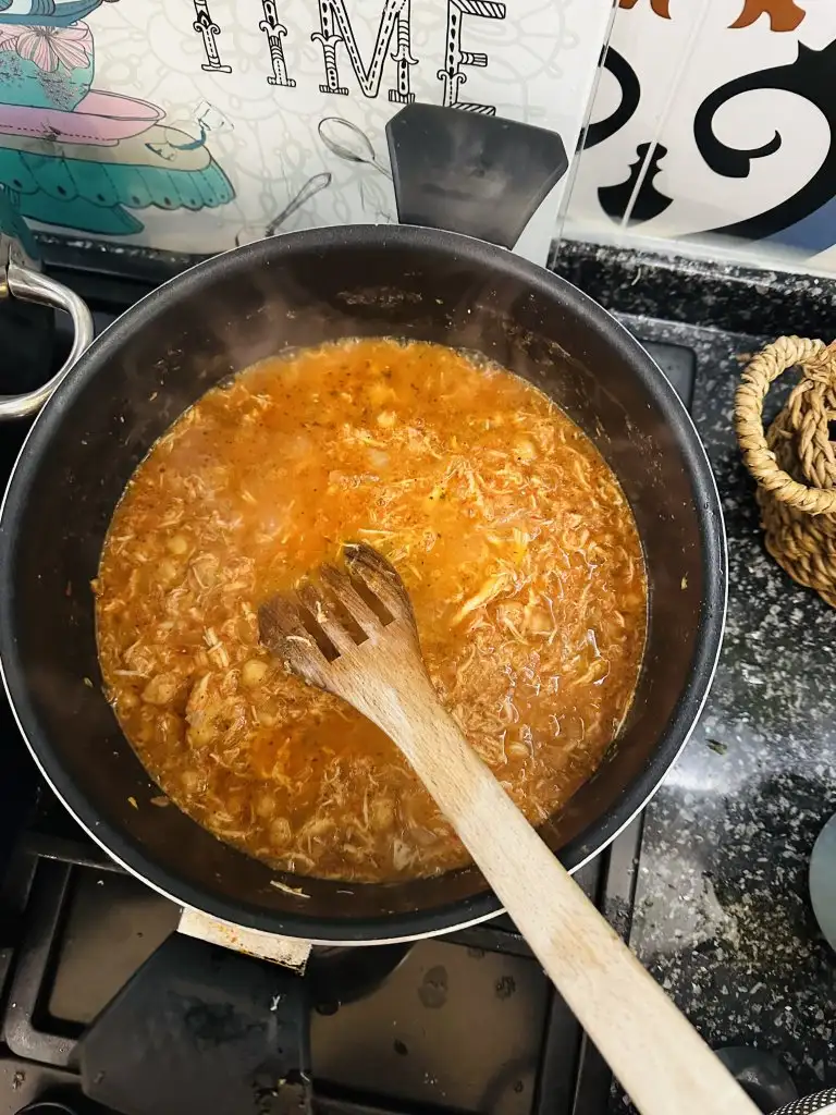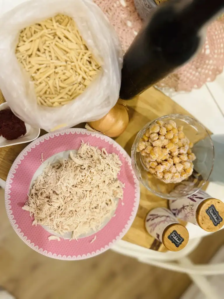 - Tavaya sırası ile didiklenmiş göğüs etini, nohutları, baharatları, tavuk suyunu ve makarna suyunu ekleyip bir taşım kaynatın.