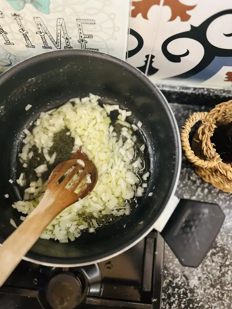 - Derin ve geniş bir tavayı orta ateşte ısıtın. İçerisine zeytinyağını, soğanları ekleyip iki dakika kavurun.