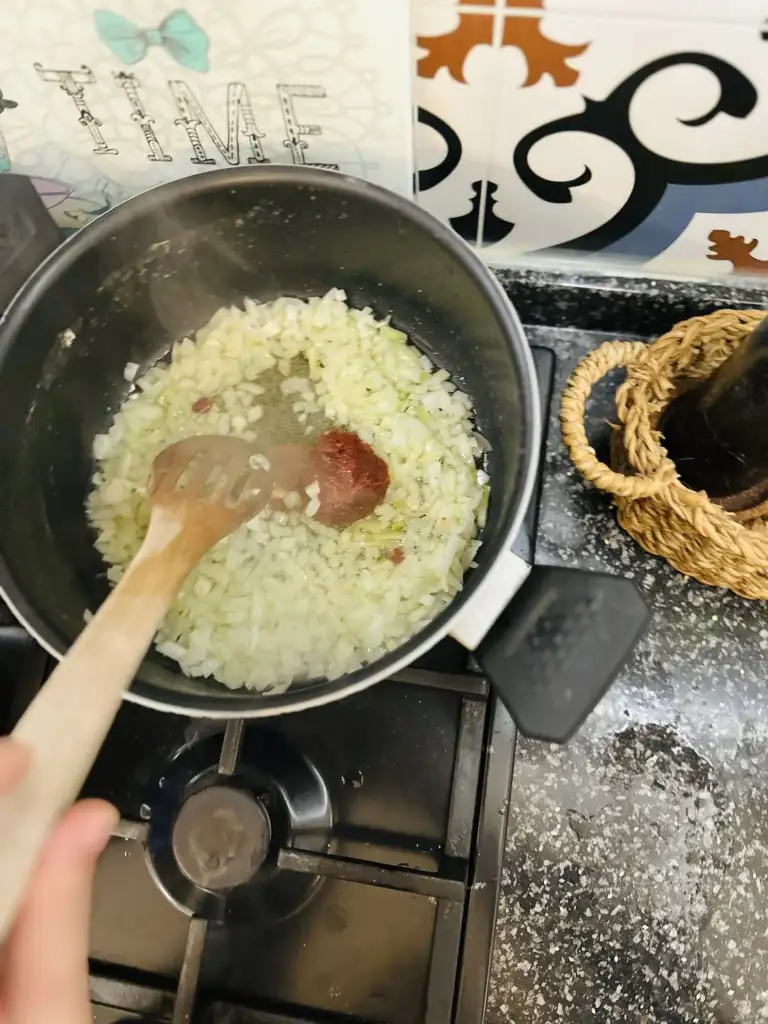 - Salçayı da ekleyip kokusu çıkana kadar kavurmaya devam edin.