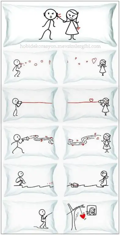 onun yatağının üstünde iki yastık duruyo o yastıklara kılıf yaptıracaktım birinde kırmızı kalbin yarısı diğerinde diğer yarısı yanyana kalp bütünleşiyo ayrıca birinde onun birinde benim baş harflerimiz yazacak bu şekilde güzel bi dizayn yapıp bunu yaptıracaktım bi fikir olsun sizlerede.