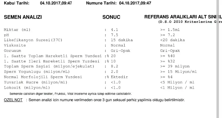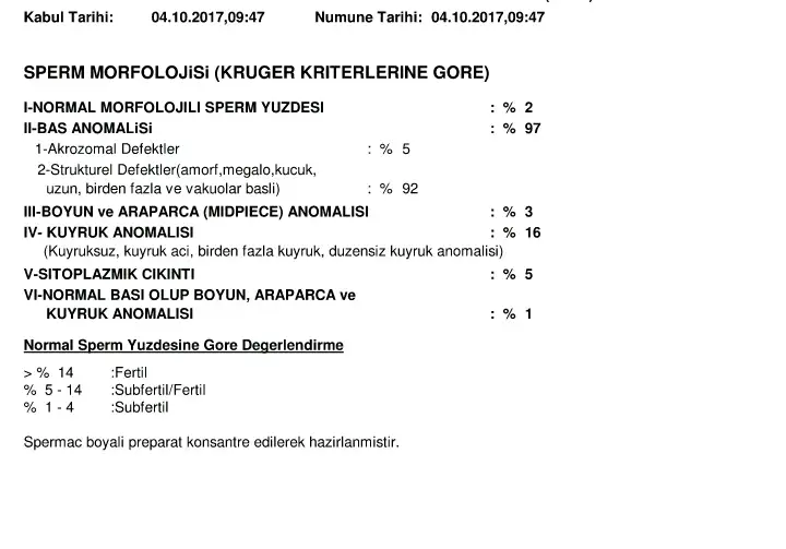 Temmuzda yaptırdığımiz testte sperm sayisi ml de 34 milyon ileri hizli 3 morfoliji 1 di