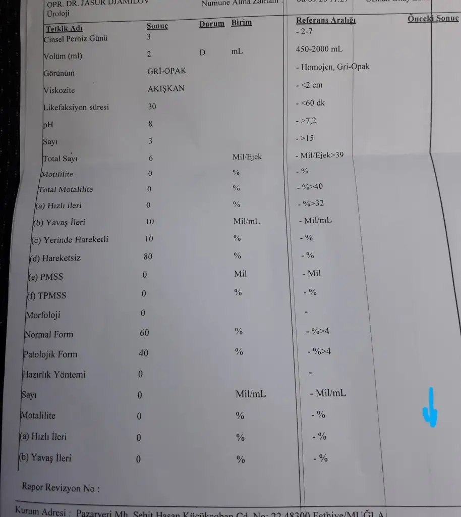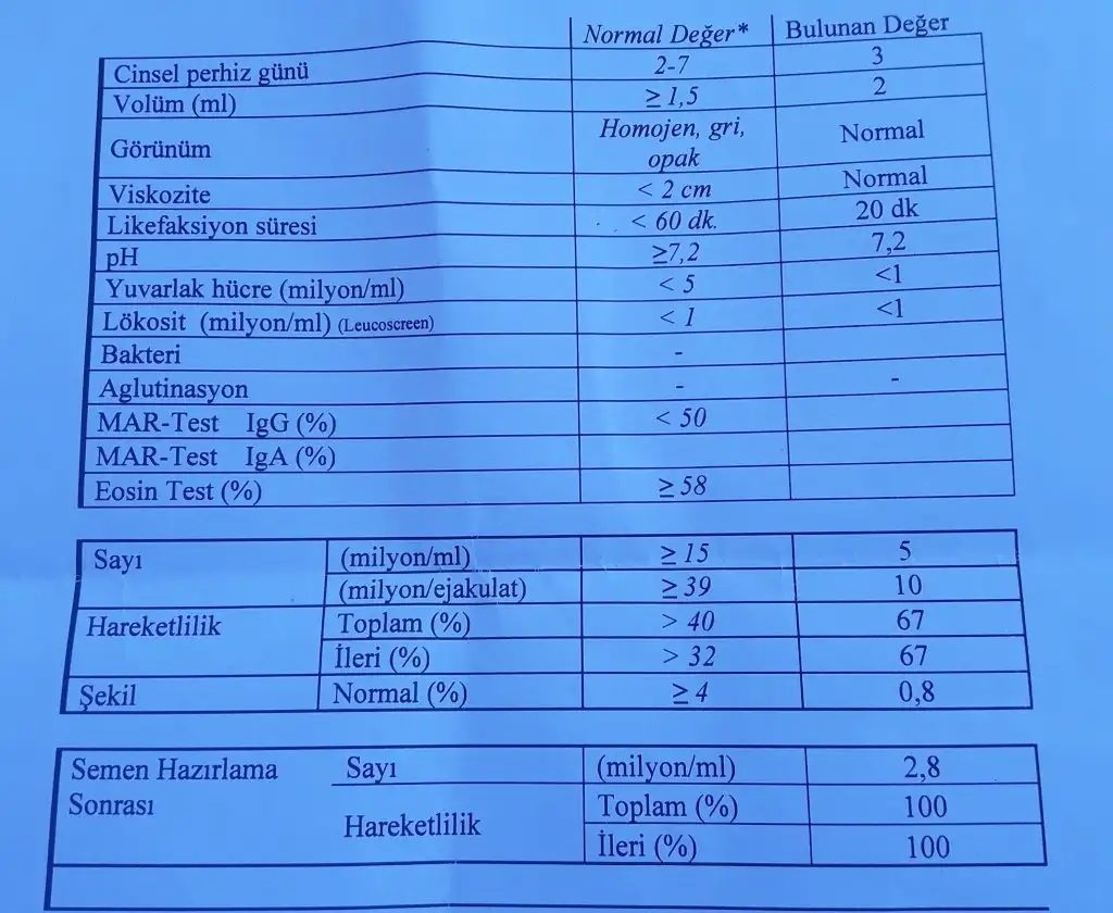 DOKTOR takviye falan vermedi varikosel var esimde ameliyat önerdi. Bizde 6 ay beklemekten yanayız. En son olmazsa ameliyat diye düşünüyoruz. 2.testte 5 milyon olmuş ikinci testi tekrar atayimMerhaba yanlış yorum yapmak istemem çokta iyi anladığım söylenemez ama ikinci testte sayı düşük, bir de şekil dediği sekme morfoloji mi acaba eğer morfoloji ise o değer de düşük. Doktorunuz ne dedi takviye başlamıştır sanırım