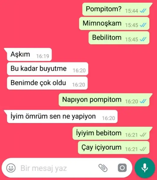 Demek ki ben yıllardır "aşkım" diye hitap ettiğimi sanarken adamın kulağına "bebitom, pompitom" diye gidiyormuşhahahahahahahNe güzel cevap vermiş ama