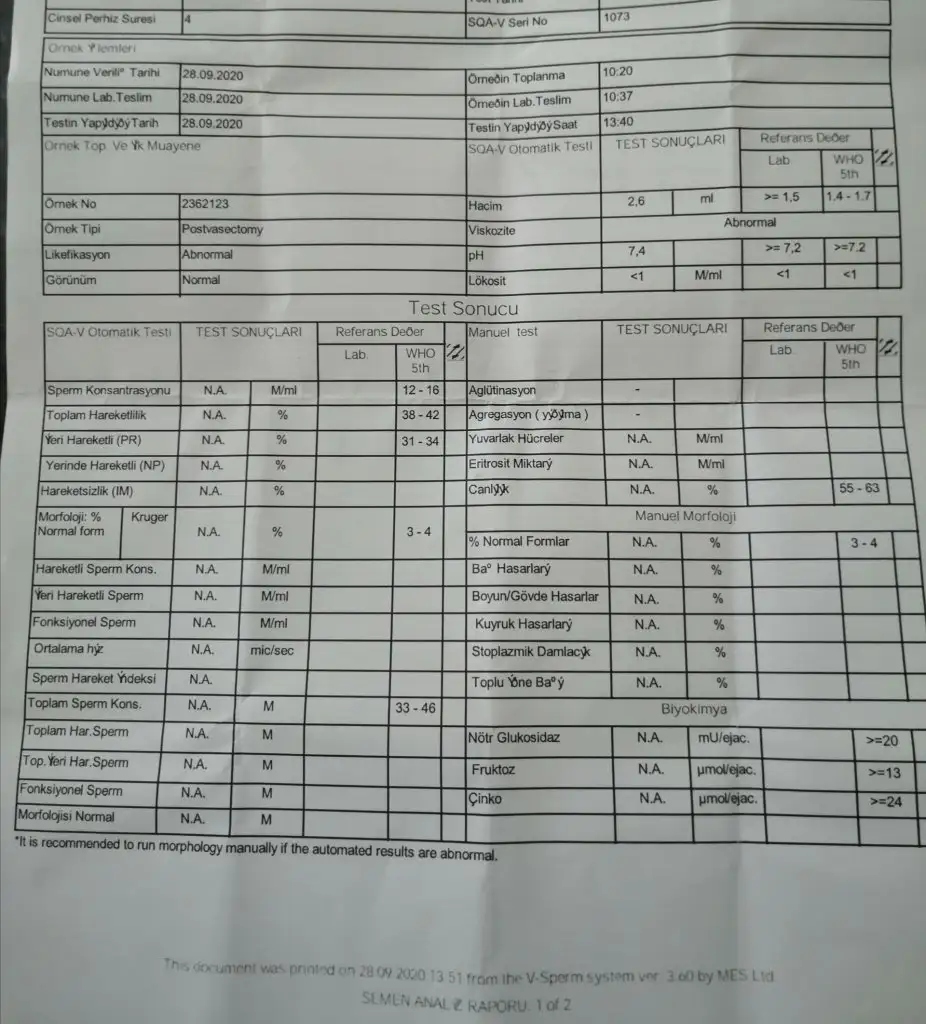 Geçmiş olsun sizi çok iyi anlıyorum bizde Azospermi ile yaklaşık iki ay önce tanıştık daha yeni yeni alışıyorum günlerce 1 dakika uyumadan yaşadım ağlama nöbetleri geçirdimMerhaba kızlar, acil sizden bilgilerinizi bekliyorum. Bana yardım ederseniz coook sevinirim. Bizde çocuk olmuyor diye kontrole gittik benim eşimde hic sperm yok demiş doktor ve 2 hafta sonra tekrat teste cağırmış ve tekrar sperm testi verilcek demiş. Sizce sonucta bir değişiklik olur mu. Uyku tutmadı üzüntüden kalbime vurdu. Eğer sperm olması tedavi nasıl oluyor şansımız var mı bebek icin☹ ilk teste hic olmayıp sonra sperm bulunması garip olur gibi geldi bana, ondan önce iliskiye girdik catlma oldu diye bende acaba onun etkisi var mıdır. 2 gün sonra verdi eşim sperm testini. Kafam çok karıstı