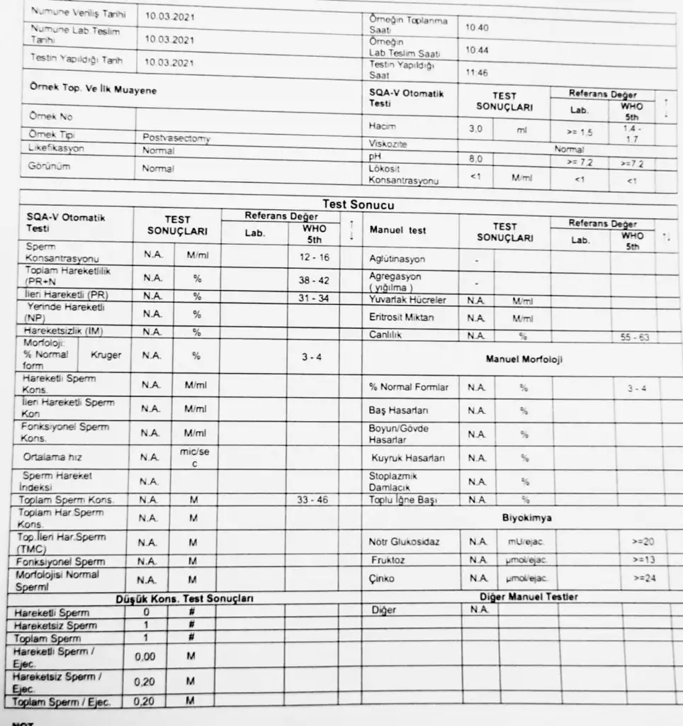 Haklısınız. Bizimde sizin gibi çok büyük bütçeler ayırma imkanımız yok. Emre Bakircioglu ve Tansel Kaplancanin iyi olduğunu duyduk. Belki imkanlarımız doğrultusunda onları deneriz... Öncesinde de bahsettiğiniz gibi vitamin veya ilaçlarla destekleyip sonrasında bu ameliyatı denemek kulağa daha mantıklı geliyor. En azından ameliyat yapılacaksa tüm şansımızla deneyelim. Resmini gönderiyorum acaba detaylı sperm analizi bu mu oluyor? Bilgisizliğime soruyorum... İlk duyduğumda çocuk sahibi olmak konusu imkansız gelmişti. Ama burda aynı derdi paylaşan insanlardan en azından olumlu hikayeleri okumak bile bana çok motivasyon oldu. Teşekkür ederimBence daha iyi araştırılması lazım; öncekikle orşit ile ilgili ne kadar hasar var anlaşılması için iyi bir doppler gerekiyor ve androloji konusunda uzman bir ürolog. Evet herkes ama herkes TESE diyecek ama eğer yaşlar el veriyorsa bence bir kaç doktor deneyip tedavi olmaya gayret etmek lazım. Biz hastası değiliz ama Celalettin Peru tedavi konusunda iyi başarıları olan birisi; biz neden hastası değiliz derseniz istediği tetkikleri; istediği yerlerde yaptırabilme şansımız şu an yok önce üroloji de bir tedavi deneyeceğiz; TESE denirse de başka yönlere yöneleceğiz. Güzelce takviye edin hücreleri; omega 3, promenk-impryl gibi vitaminler, coq10, resveraratrol, arı ürünleri kullanabilirsiniz. Sakin olun; bol bol araştırın; sadece forumları değil tıbbi makaleri okuyun ve detaylı spermiyogram yaptırın. Yapan bir kaç yer var; istanbul andromed; ankara a life, ankara centrum klinik gibi.