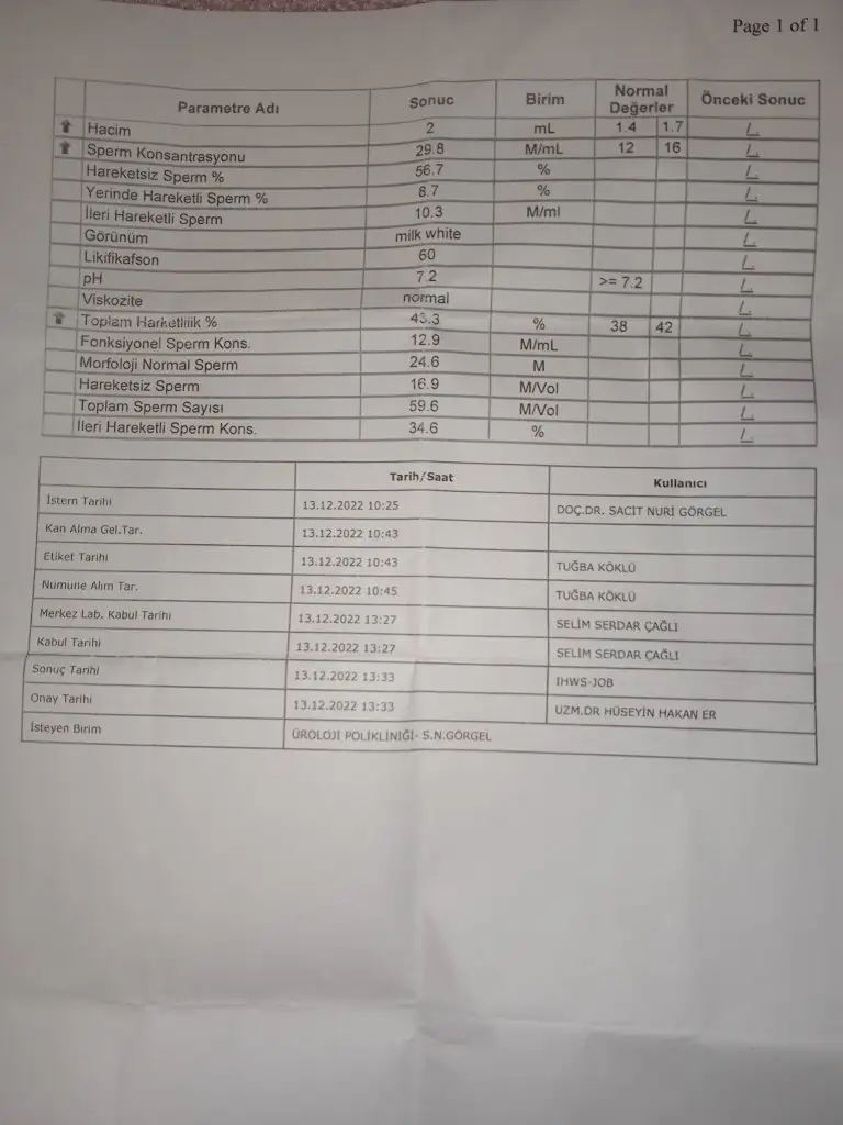 Merhaba arkadaslar. 4 senedir evliyiz. 1 senedir korunmuyoruz. Ancak gebelik maalesef oluşmadı. Spermiogram testine göre toplam 105 milyon sperm var. her ml 21 milyon sperm var. %85 morfolojimiz güzel. Ancak hareketsizlik var. Yüzde 55 hareketsiz, yüzde 30 hızlı ileri , yüzde 10 yavaş ileri, yüzde 5 yerinde. Ayrıca eşimde sol bölümde varikosel cikti. İstirahat halinde 2.7 mm valsalva halinde 3.9 mm dır. Ve reflu akimi izlenmektedir. Testestoron düşüklüğü var. Ameliyat gerekir mi. İlaç tedavisi var mi? Bu hastaligi yaşayan ameliyat olan, ilaçla tedavi olan , var mi. Yardim i olabilir misiniz?