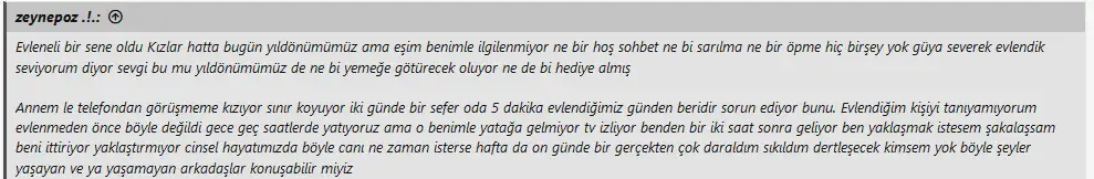 Annem le telefondan görüşmeme kızıyor sınır koyuyor iki günde bir sefer oda 5 dakika evlendiğimiz günden beridir sorun ediyor bunu. Evlendiğim kişiyi tanıyamıyorum evlenmeden önce böyle değildi gece geç saatlerde yatıyoruz ama o benimle yatağa gelmiyor tv izliyor benden bir iki saat sonra geliyor ben yaklaşmak istesem şakalaşsam beni ittiriyor yaklaştırmıyor cinsel hayatımızda böyle canı ne zaman isterse hafta da on günde bir gerçekten çok daraldım sıkıldım dertleşecek kimsem yok böyle şeyler yaşayan ve ya yaşamayan arkadaşlar konuşabilir miyiz