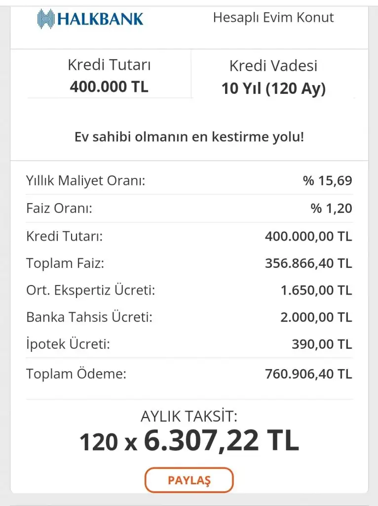 Mesela çektiğiniz rakam 400000 olsa sizin için hesapladım, ortalama şöyle bir ödeme olacak