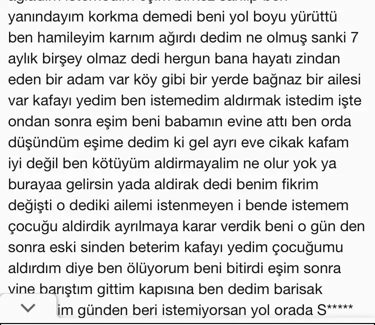 Ölümü isteyecek kadar büyük çaresiz derdiniz yok kolayı var boşanın çok basitEşimle severek evlendik ona çok aşığım çok seviyorum ama o sevgililiğimiz boyunca bana hep şiddet uygulayan bana devamlı küfürler hakaretler eden biriydi aşırı kıskanç eve misafirler gelince delirirdi bana söz verirdi değişecem diye her defasında inanırdım ve her defasında beterini yapardı düğünüme 5 ay kala beni kuzeniyle aldattığını öğrendim biz 1 aya yakın küsmüştük o sırada mesajlasmislar ben sonradan mesajları gördüm bana dedi ki sen ayrılmıştın dedi ben bağırdım çağırdım kafayı yedim bunalıma girdim benden bir özür bile dilemedi ben babasını aradım oğlun böyle böyle yaptı diye babasıda çocuğumu var birşey olmaz dedi ben gittim evinin önüne bana bunu nasıl yaptın diye bana tokadı yapıştırdı ben eve geri gittim dayanamadım ben yinede barıştım evlendik hiç mutlu değildi düğün zamanı bir tebessüm bille etmedi bana düğün günü ağzın kokuyor dans ettiğimiz sırada dedi. Bana küfürler etti işte evlendikten 1 ay sonra kardeşim ameliyat olfu beni hastaneye götür dedim kavga çıktı beni dövdü sonra dışarı çıktı annesigille oturdu çay içti annesine şöyle diyordu anne ben bunla evlendim başımı yaktım demi anneside oğlum evet bu kız pislik dedi sonra duydum ben bunları babamın evine gittim eşim geldi almaya gitmedim gel dedi indim aşağı beni gece karanlik yolda burakti bileziklerimide elimden aldı gitti neyse bende annem gille gittim aradan 1 ay geçti barıştık tâbi bu sürede babası geldi dediki babama senin kızın detarjan kullanıyor çamaşır suyu kullanıyor karılık yapmıyor oğlum onun yüzünden kafasini vurdu neler dedi neyse barıştım eve geldiğim bir gün sonra büyük bir kavga çıkardı neymiş flaşı suya girmiş kapıları kirdi küfürler hakaretler neler eşimin bir huyu var çamaşır makinesi bozdun buzdolabına ne yaptım ona dokunma birdaha çamaşır makinesini kullanma makinenin kapağı açık diye oropsu çocuğu bu niye açık diyor neyse hep kavga böyle ailesiyle altlı üstlü oturuyorum bu arada çok hastaydım eşime dedim beni hastaneye götür beni baban görürsün banane diyip tekrar küfür hakaret o gün hamile olduğumu öğrendim şok oldum ağladım istemedim eşim birkez sarılıp ben yanındayım korkma demedi beni yol boyu yürüttü ben hamileyim karnım ağırdı dedim ne olmuş sanki 7 aylık birşey olmaz dedi hergun bana hayatı zindan eden bir adam var köy gibi bir yerde bağnaz bir ailesi var kafayı yedim ben istemedim aldırmak istedim işte ondan sonra eşim beni babamın evine attı ben orda düşündüm eşime dedim ki gel ayrı eve cikak kafam iyi değil ben kötüyüm aldirmayalim ne olur yok ya burayaa gelirsin yada aldirak dedi benim fikrim değişti o dediki ailemi istenmeyen i bende istemem çocuğu aldirdik ayrılmaya karar verdik beni o gün den sonra eski sinden beterim kafayı yedim çocuğumu aldırdım diye ben ölüyorum beni bitirdi eşim sonra yine barıştım gittim kapısına ben dedim barisak baristigim günden beri istemiyorsan yol orada S***** G** (Defol) senin değerin yok bu evde bana o çocuk benden değil bille dedi bana devamlı burda diyemeyeceğim küfürler ediyor babası bana hakaretler ediyor annesi hergun neler diyor annem beni çağırıyor ayda yılda Bir kızım çarşıya gidek beraber izin vermiyor anneme babama devamlı hakaretler küfürler ölmek istiyorum ben bittim beni kapıdan dışarı bırakmıyor sevgililiğimiz boyunca da böyleydi daha neleri var bir bilseniz devamlı başka kadınlar anlatır ne güzel kadın daş gibi seni çekemem ben diyip duruyor yemin ederim işten gelir yemek hazir üstü yıkanmış hiç Bir gün kavga çıkarmam susarım hep sabah annesi akşam oğlu ben bittim