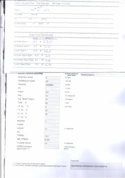 Kızlar eşim ameliyat olalı 70 gün oldu bugün devlet hastanesinde test yaptı.sperm sonucunu ekledim pek birşey anlamadım yanına aynı hastanede daha önce yapılan (haziran 2017 ) destin değerlerinide yazdım bugünkü testinden önce verdiği testide (kasım 2017 ) altına ekledim. Anlayan banada anlatsın düzeltme varmı yokmu