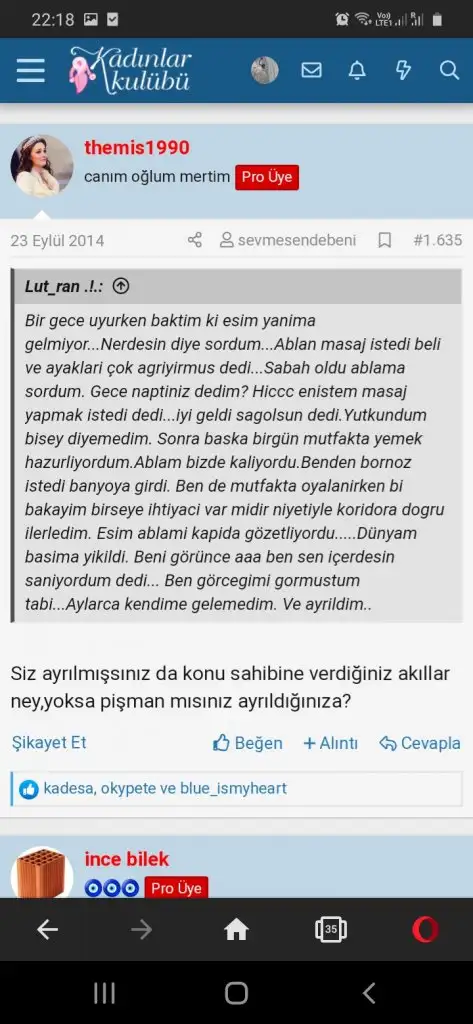 Konu sahibinin tutarsız söylemlerini koskoca kadınlar klübünde bi ben mi farkediyorum? Yoksa üzerine tıklayıp aaa eski üyelik hmm baya mesajıda var kesin doğru hikayedir mi diyoruz. Bir an gelip Kocam odada sen vardın sanıyordum dedi diyor bi an gelip kardeşin yollu zaten o beni tahrik etti gibi şeyler...Kapıdan girmiş merhaba enişte bak bu kuku şimdi ona bi şeyler yapıcam sen de izle mi demiş? Sapık bey de "hayır hayır bakamam eski kapının anahtar deliğinden bakmak daha heyecanlı" deyip hülya koçyiğit gibi hızlıca koşup yanınıza mı sığınmış?