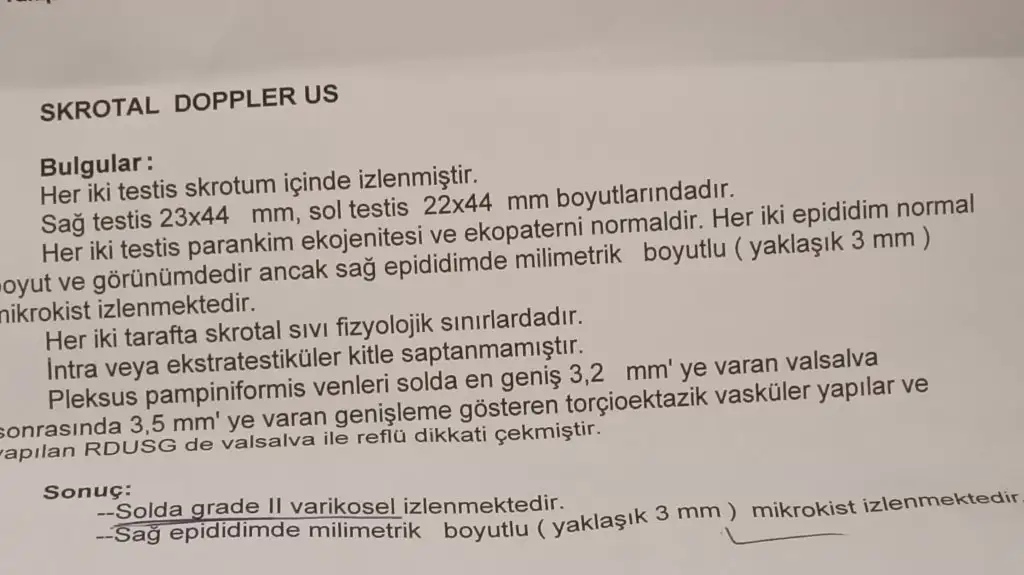 Teşekkür ederim canım doktor kist önemli bir şey değil zaten dedi ama ameliyat ol dedi daha fazla ilerlemeden çünkü çok çabuk ilerleyen bir hastalık dedi kararsız kaldık ameliyat iyi mi kötü mü bilmiyoruzGrade 2 orta derece demek, yani çok ilerlemiş bir varikosel değil. Ameliyat olursa eşiniz ve gerekli takviyeler kullanırsa hemencecik toparlar. Kist için de sanirim antibiyotik benzeri ilaclar kullanılır. Ve ne güzel demişsiniz 28 daha yaşınız. Hemen olursa vakit kaybı olmamış olur