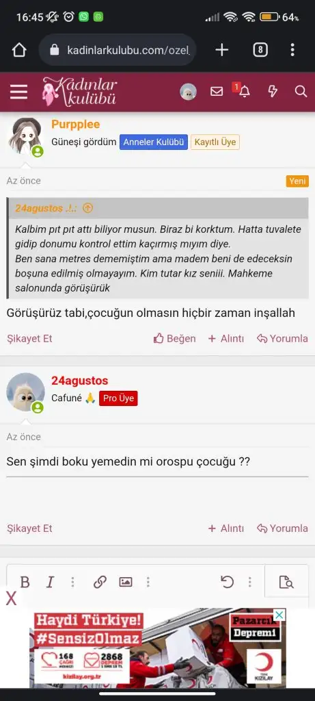 Siz niye böyle bir kadınla muhatap oldunuz ki? Özel mesajlar yönetime bildirilebiliyor. Sizi acınızla çocuğunuzla vurmuş ama kendi çocuğunu düşürdüğü konuma baksın.Burası aktif buraya bırakıyorum bunu. Banlayacaklarsa beni banlasınlar.