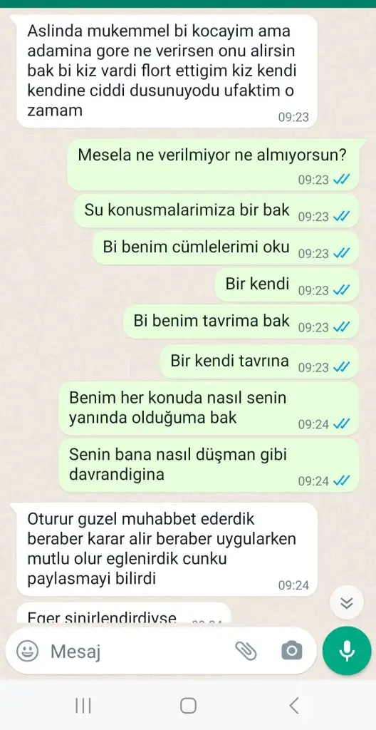 ( yazma bana demisti bende su saatten sonra senin gibi birine edecek bir kelimem yok dedim bir daha da yazmadim. 1 saat geçti şimdide yalandan çocuklar napiyor yemek yediler mi sıcak birseyler yap vs demiş. )