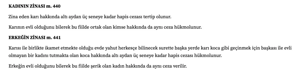 başka bir erkekle evli olmayan bir kadını karısıyla yaşadığı eve getirir veya toplum içinde ilişki yaşarsa. uygulamada nasıl yaptırımlar vardı yaşım o döneme yetmediği için bilemeyeceğim. eşitsizlik olduğu bariz tabii.