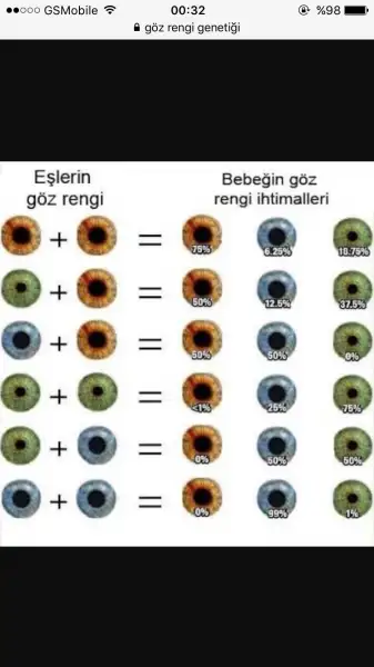 Anladığım kadarıyla eşiniz renkli gözlü siz kahverengi. Bi sorun yok ki bunda. Olması gayet mümkün. Demek ki sizin genlerinizde de renkli göz geni var. %25 ihtimalle çocuğunuz renkli gözlü olabilir ve o ihtimal gerçekleşmiş yeşil olmuş. Bi sıkıntı yok yani. Benim söylediğim bu değil. Anne baba ikisi de mavi gözlüyse çocuk kahverengi olamaz. Bu durumun tersiyle karıştırmış herkes. Yani anne baba kahverengiden mavi gözlü çocuk olur. Şimdi buraya tabloyu çizebilsem çizicem herkes anlasın diye.