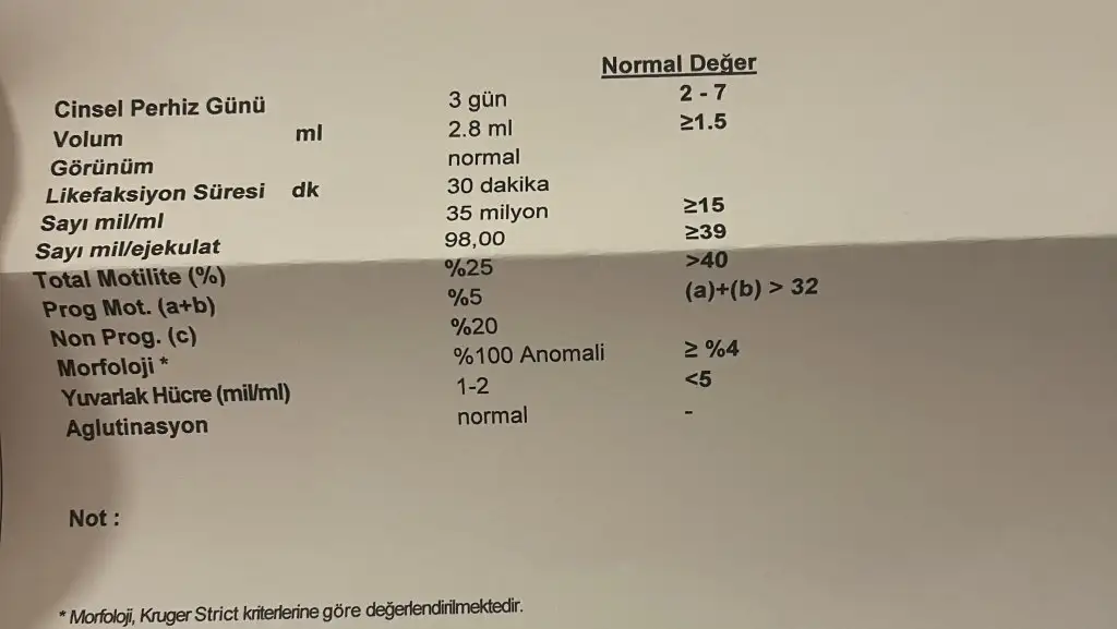 Eşimin sperm sonuçları bu şekilde. Morfofoloji yani şekil bozukluğu%100 görünüyor. Hareket de az. Hormonlar ve ultrason normal. Doktor doğal yollardan çocuk sahibi olmanın çok düşük ihtimali olduğunu bu yüzden tüp bebek tedavisi uygun olduğunu söyledi. Sizlerde böyle bir durum yaşayan var mı? Hiç umut yok mu? Yapabilecek başka şeyler olabilir mi?