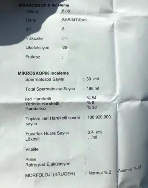 Yaa çok çok çok umut verici. Oturduk ağladık eşimle. Yaşım 30 oldu, ödüm kopuyor anne olamayacağım diye. İnşallah olur. Yalnızca 4 aydır deniyoruz sizce doktor ve tedavi trafiğine girmek için erken mi? Biraz daha mı denesek?Değerler gayet iyi. Morfoloji anormal değilse sayı ve hız iyi olduğu sürece sıkıntı değil. Ben %1 morfolojiyle doğal yoldan hamile kaldım.