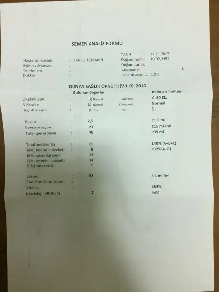Ilk tahliller iyiydi sayı olarak bildiremek hatirlamiyorum normal bir erkeğin sperm oranlarinin yüzde 10 altıydi umut dedim sonra sadece aradan 3 ay geçmedi bile bayramdan sonra yaptığı 3 tahlilde kötü çıktı ileri hareketlilik sifir dedi sperm sayısı düşük dedi ve bunu 3 ayri doktor şöyledi sadece inanmak istemiyorum ama buna sukur diyebiliyorum