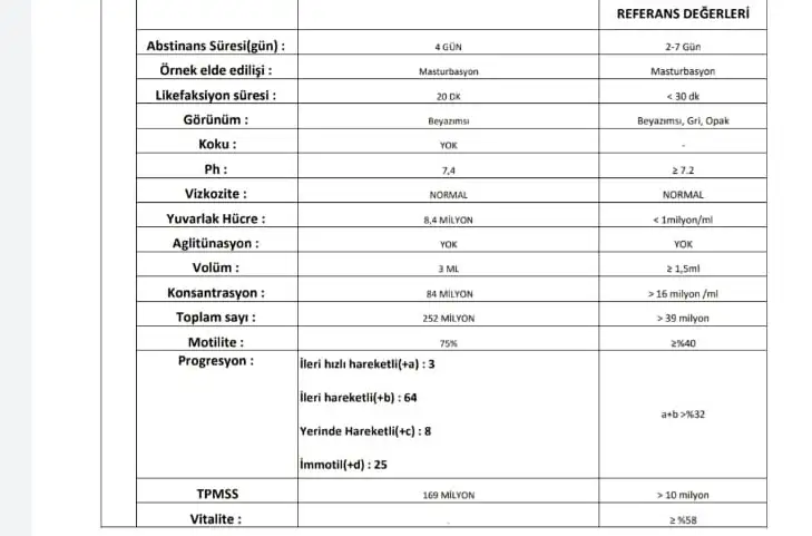 200 milyona mi bekleyin dedi canım eşimin 22 milyon çıktıEşimde alkol yok sigara vardı bıraktı çok şükür 1 yıl olcak ben içiyorum ama çok fazla değil arada kadınında bırakması gerektiğini ilk defa duydum şuandaşubatın 1 i ranndevğsü var doktor daha önceden az daha deneyin olmazsa pahalı ilaçlar var onları kullanacaksınız dedi eşinin tüpleri açıkmış değerleri normal mi demişti ben tüplerime baktırdım açık tahlillerim temiz. Eşimin değerler kötü ama benim kadın doğum doktorum sperm sayısı 200 milyon çok fazla iyi bu az daha bekleyin dedi diye bekliyoruz yoksa hemen tüp bebeğe başlayacaktık geçen ay