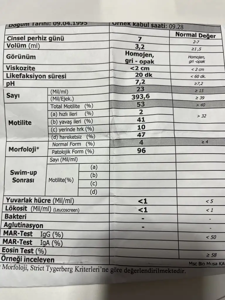 Bir de sigara/alkol kullanımı varsa direk bırakmanız fayda sağlayacaktır. Özellikle sigara sperm morfolojisini kuyruk hareketini vs olumsuz yönde etkiliyormuş.