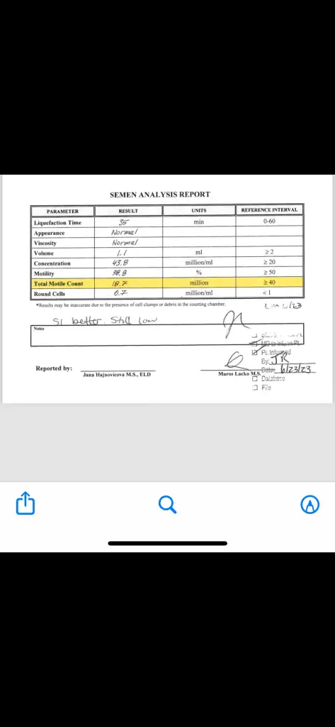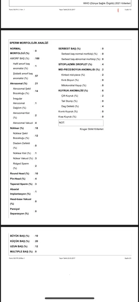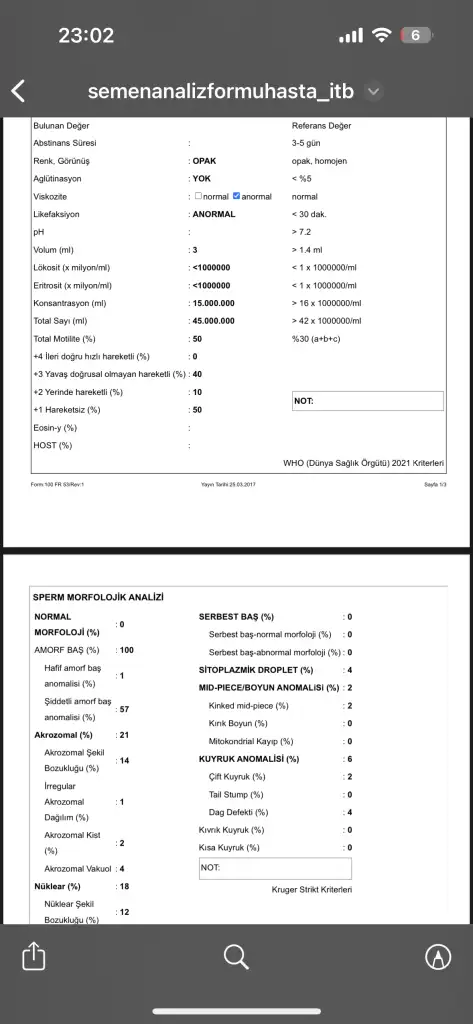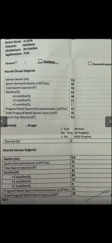 Merhaba hanımlar biz 1yildir çocuk istiyoruz ben bugün muayene oldum doktor 3yumurta oluşmuş bunu değerlendirmeliyiz dedi çatlatma iğnesi verdi göbeğime yaptim umutluydum ama eşim ayni gün içerisinde sperm testi verdi örolojide doktor sonuçlar için hiç olumlu konuşmamış daha önce sperm testi vermişti sadece sayı 4 milyon ve morfoloji 3dü ama şuan sayı biraz yükselmiş bu sefer toplam hareketlilik ve ileri hareketlilik de düşmüş sayı hareketlilik çok düşük demiş doktor aşılama deneyin tüp bebeğe başvurun demis çok üzüldük eşim bana anlatırken çenesi titriyordu Allahtan umut kesilmez tabi ama normal yolla denemek istiyoruz bu şekilde hamile kalan varmı bana benim gibi olanlara umut olun daha önce gebelik olustu normal yolla ama 11haftalikken kalbi durdu kurtaj oldum bu sefer değerler daha düşük çıkmış 5aydir cabaliyoruz olmadi tekrar olmazsa die korkuyoruz eşimin sperm sonuçlarını da paylaşıyorum anlayanlar ilgilenebilirmi?