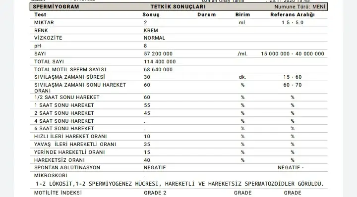 normal gözüküyor ama ileri hızlısı yok muhtemelen o yüzden gebelik oluşmuyor hızı arttıracak şeyler yapınKızlar eşimin sperm değerleri iyi mi ben anlamıyorum pek siz daha tecrübelisiniz yardımcı olur musunuz