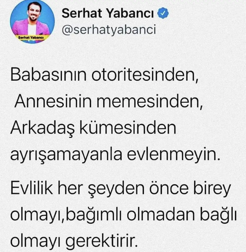 Ben birinci ikinci evlilik demiyorum farkındaysan. Önemli olan evlilik. Babam yada onun ailesi yüzünden nişanı attık demiyorum. Ben orda eşimden gel 2 bilezik de biz alırız kendimize hallederiz demesini beklerken sen nasıl konuşursun büyüklerin lafına girip de diyip küfretmesine takılıyorum. Her kafa farklı çalışıyo😂 konunun aslını öğrendiğimden beri eltim anlatmış ortalığı, karıştırmış diye onu suçlamıyprum burda hata benm eşimin. Yani gerisi boş insan seviyosa her daim arkasında olur. İnsan seviyosa önplanda tutar. İnsan seviyosa vakit geçirir. İnsan seviyosa neyden mutlu oluyosa onu yapar istemese bile.