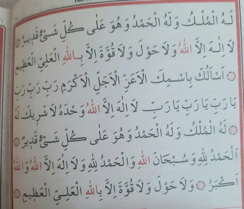 Lâ İlâhe illâllahu vahdehü lâ şerike leh,lehü’l Mülkü ve lehül hamdü ve Hüve ala külli şey’in Kadir.Lâ ilâhe illallahu ve lâ havleve la kuvvete illâ billahil Aliyyil Azim.Es-elüke bismike’l-e’azze’l-ecelli’l-ekrem.Rabbi,Rabbi,Rabbi, Ya Rabbi,Ya Rabbi,ya Rabbi.Lâ ilâhe illallahu Vahdehu lâ şerike leh,lehül mülkü ve lehül hamdü ve Hüve alâ külli şey’in Kadir... Elhamdüli’llâhi ve Sübhan-Allahi ve’l-hamdülllahi ve lâ ilâhe illâllahu v’Allahhu Ekber,ve lâ havle ve lâ kuvvete illâ billâhi’l-Aliyyi’l-Azim.”...
