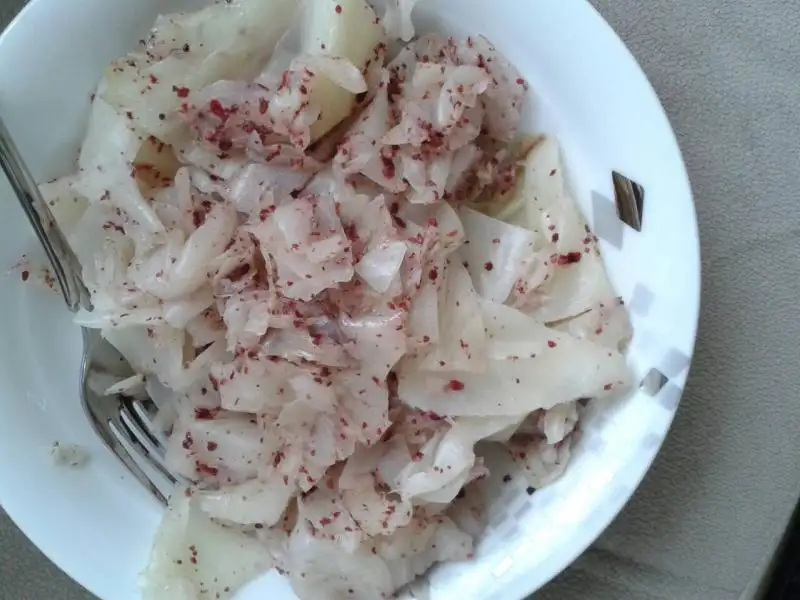 Bu benim bugunki yemegim kizlar haslanmis lahana sumak kimyon limon azicik yag aksama da yemeyi dusunuyorum haftada iki gun bu sekilde yapicam kahvaltidan sonra butun gun adece bu nasil olur sizce