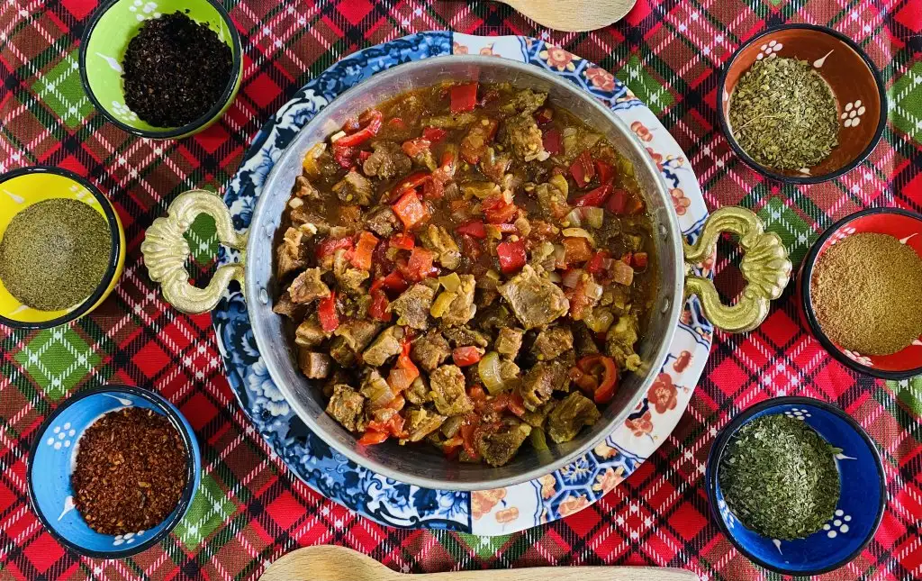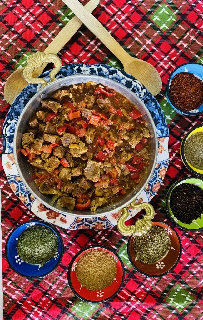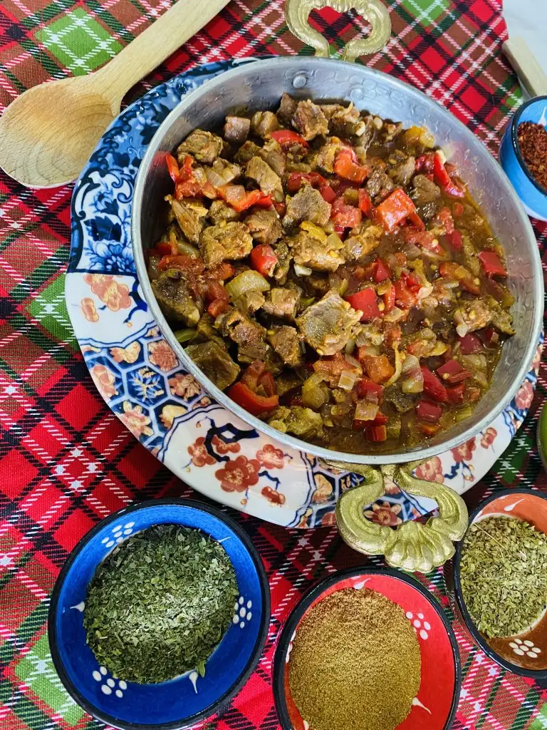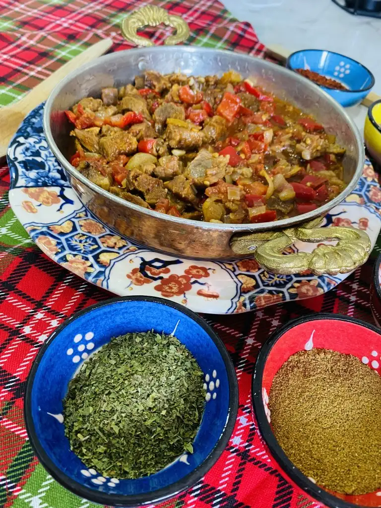 etleri kusbasi dograyip düdüklü tencerede yarim saat pisiriyoruz. Tavada dogradigimiz soganlari kavuruyoruz sonra pisen etleri ekleyip biraz kavuruyoruz tabiki sivi yag ile :)birZ etlerde kavrulunca dogradigmiz kirmizi biberi salcayi ve sarımsaklari ekliyoruz biraz da oyle kavrulunca domates ve pisen et suyumdan bir miktar ekliyoruz.Bahartlarida ekleyip karistirp kapagini kapatalim kivam alincaya kadar pissin iste bukadar:) afiyet olsun