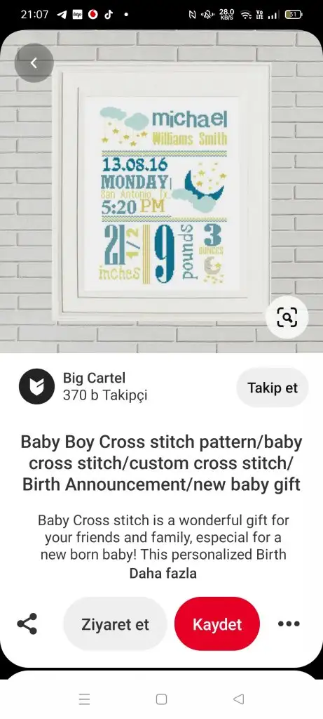 Şöyle doğum tarihini kiloyu filan ekledikleri şeyler de var. Pintereste ya da Google'a cross stitch for baby boys yazarsanız daha çok örnek bulursunuz.