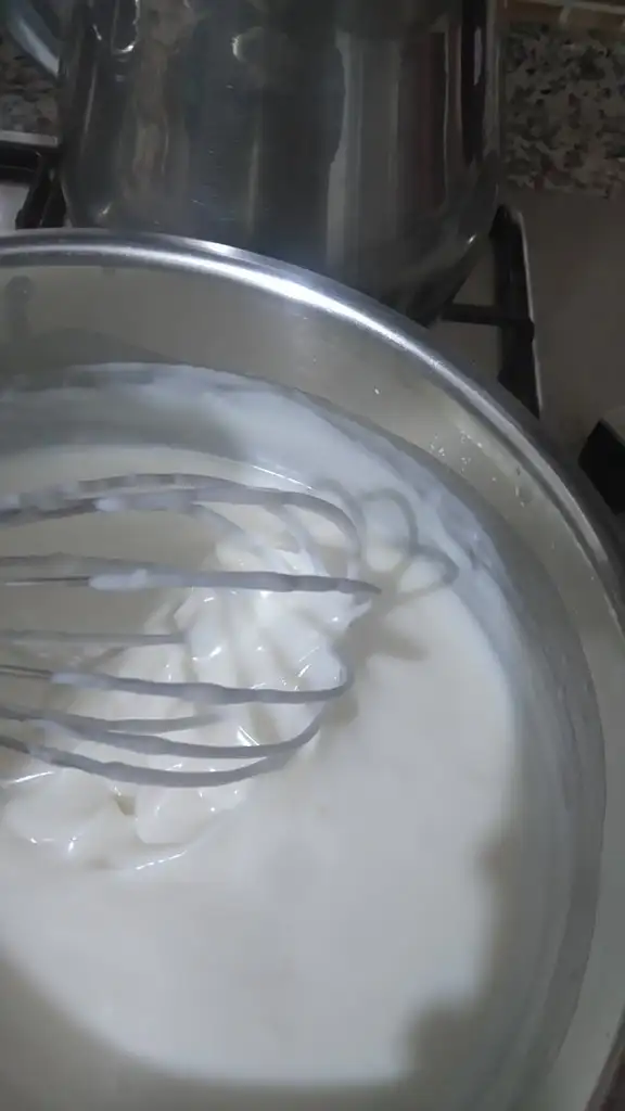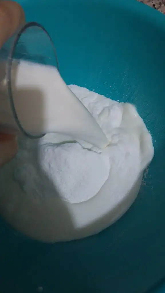 Etimek tatlısının üzeri için; bir kaba 1 paket krem şanti koyun. Üzerine 1 su bardağı soğuk süt döküp, mikser ile krem şanti koyulaşana kadar çırpın. Krem şantiyi muhallebinizin üzerine dökmeden önce, muhallebinizin iyice soğumasını bekleyin. Eğer muhallebinizin soğumasını beklemezseniz krem şanti eriyerek kötü bir görüntü oluşturur.