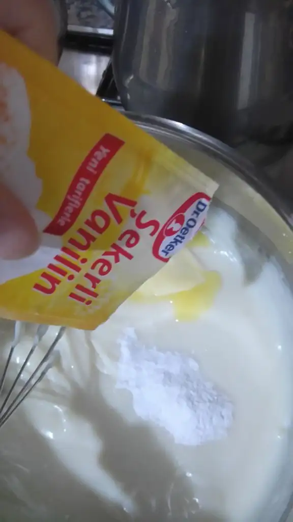 Son aşamada krem şantiyi dökmeden önce etimeklerin üzerine sürdüğünüz muhallebinin soğumuş olmasına dikkat edin. Aksi taktirde krem şanti eriyeceği için tatlının lezzetini ve görüntüsünü bozacaktır.