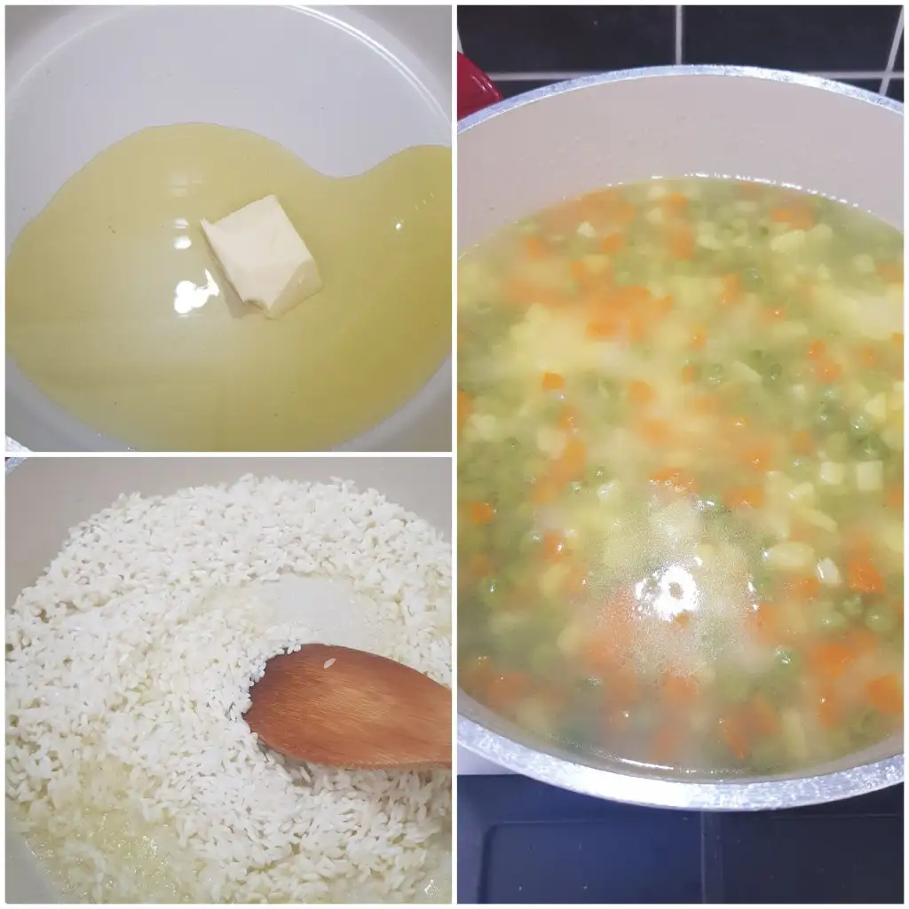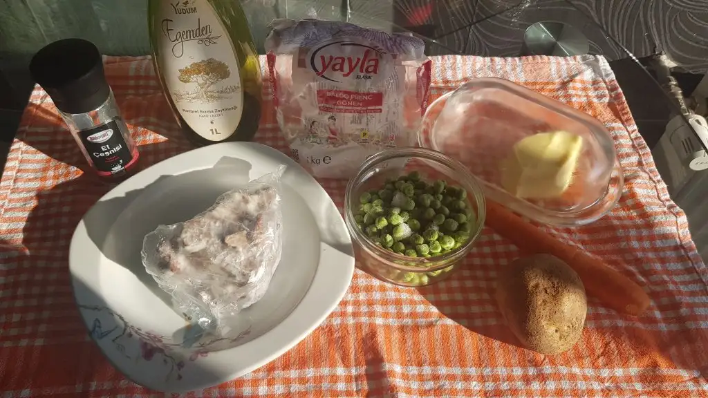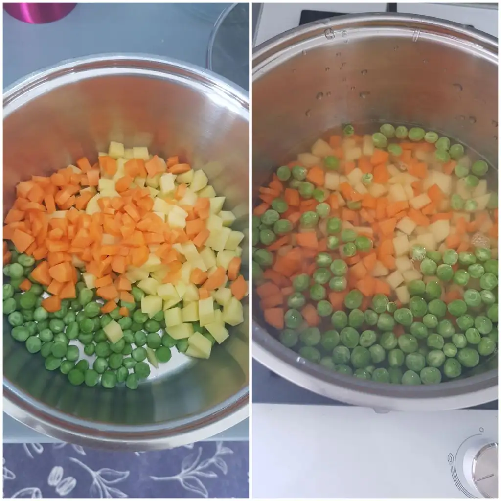 Hazır garnitür kullanmak istemediğim için garnitürü kendim yaptım. 1 adet patates ve 1 adet havucu küp küp doğradım, bir kase bezelye ile beraber hepsinin üzerini geçecek şekilde su koyup 20 dakika kadar haşladım. Bu arada pilavın yapımına geçtim, yağı kızdırdım içine 2 saat kadar suda beklettiğim pirinçleri ekledim ,pirinçler tıkır tıkır olana kadar kavurdum, daha sonra 2 bardak kaynar su ekledim, tuzunu da koyup haşladığım garnitürleri de ekleyerek kapağını kapattım.