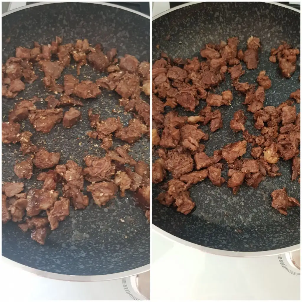 Ayrı bir tavada etleri baharatla ısıttım ve ikisini birleştirip servis yaptım.