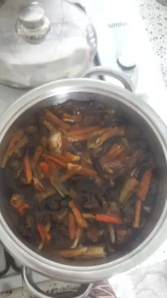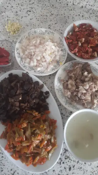 Iyi akşamlar kızlar, bugün hazır kuru sebze yemeği yapmışsın, yarışma konusu da sebze yemekleri iken katılmak istedim. Telefondan girdiğim için biraz zor oluyor, yaziları, rakamları vs düzeltmesi içinNevreste den yardım istedim birazdan gelir düzenler inşallah. Şimdi gelelim yemeğimiz için gerekli malzemelere: 1. Kurutulmuş biber, patlıcan, domates 2.Kemikli et (kuşbaşı da olur, evde kemikli vardı ben onu kullandim) 3. 1 adet büyük kuru soğan, 3 dış sarmısak 4. Bir yemek kaşığı domates, yarım yemek kaşığı biber salcasi 5. Sıvıyağ, tuz, önceden haşlamiş olduğum etin suyu.