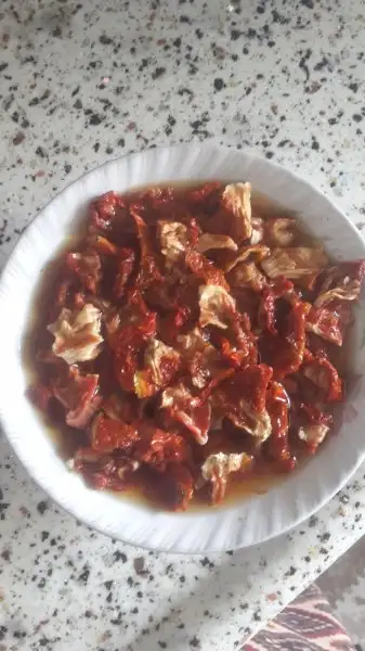 Şimdi ilk önce kuru sebzelerimi daha doğrusu patlıcan ve biberi ilk kuruluğu çıkması için hafif haşladim. Kuru domateslerimi de elimle küçük küçük kırarak parçalara ayırdı ve sıcak suyun içinde beklettim yumusaması için.