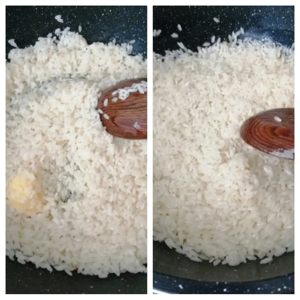 Tencereye 2 yemek kaşığı kadar sıvıyağ ekleyip üzerine yıkanmış pirinci ekleyelim. 2 yemek kaşığı tereyağı da ekleyip karıştırarak kavuralım. Tereyağını sonradan ekliyoruz ki yanma yapıp kararma olmasın