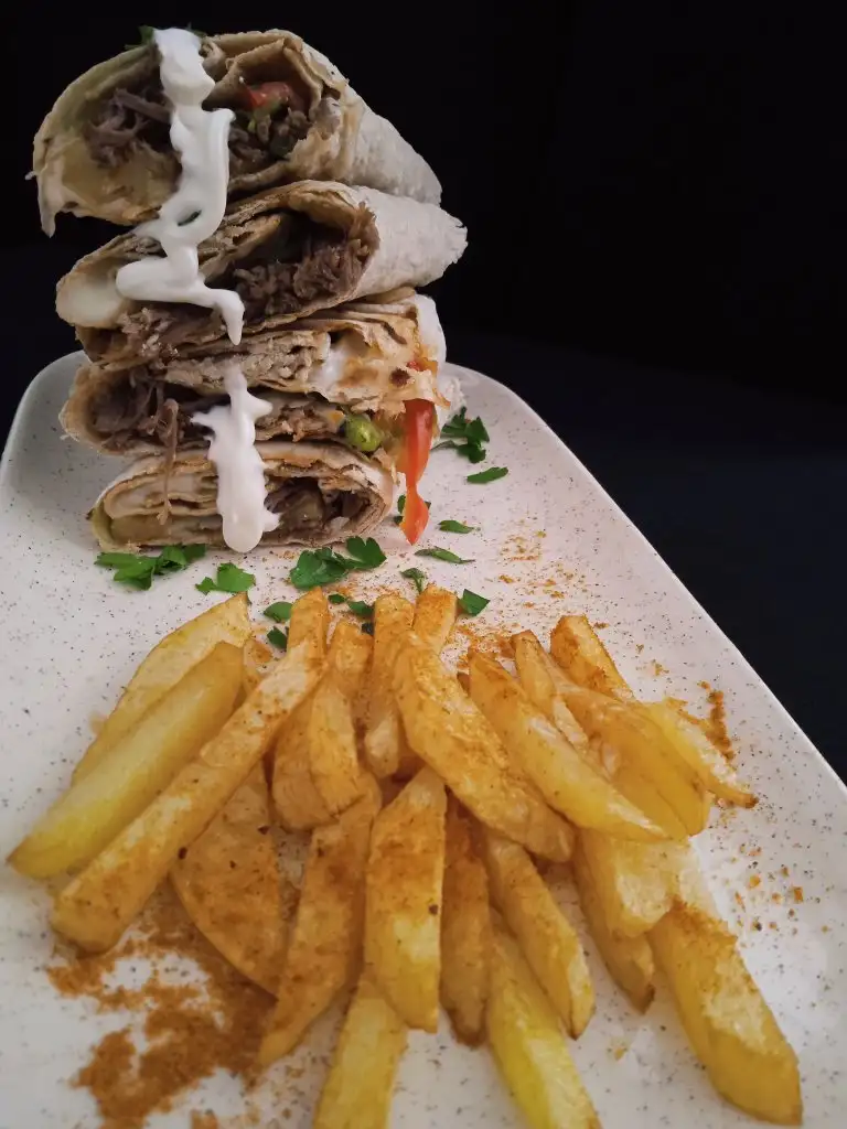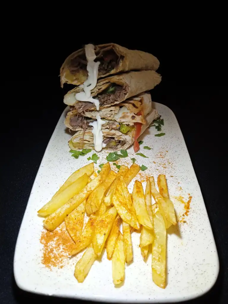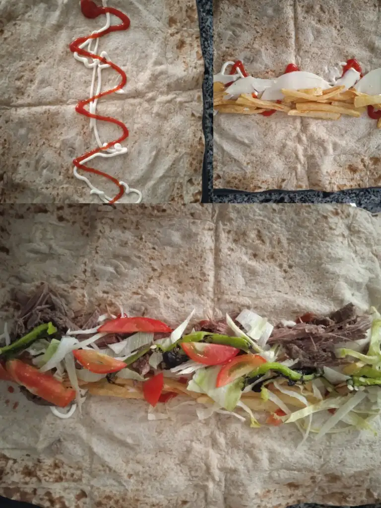 Öncelikle etimizi haşlıyoruz,kizartacaksak uzun ince doğrayabiliriz ,ben haşladığım eti tiftikledim.Etimiz haşlanirken iç malzemelerimizi hazırlıyoruz.yesillik , domates,peynirimizi doğruyoruz.patateslerimizi kızartıyoruz, biberi kızartmak yerine közlenmiş kullandım ekstra soğan da eklenebilir.Haşlanan etimizi küçük parçalara ayırıyoruz ister elle ister bıçakla lavaşımızı açıp içine önce ketçap mayonez sonra yeşillik,et, kaşar, domates,biber ve koymak istediğiniz başka lezzetleri ekleyip kenarlarından katlayarak dürüm yapıyoruz.Hazırladığımız dürümü tost makinesinde kızarana kadar pişiriyoruz bitti bu kadar
