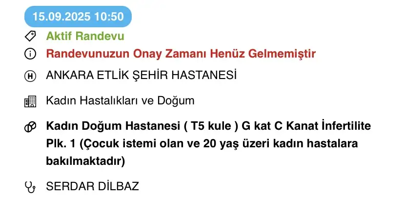 Aynen Murat çakandı diğer doktor da siz 182 den arayın olmadı biz bayağı geç randevu bulmuştuk ama bence önce tüp bebek bölümü baksın doktorlar yönlendirsin