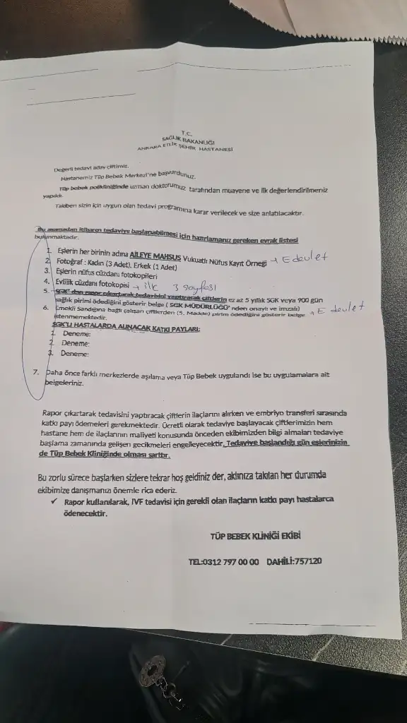 Adetin 2. Günü sulu ultrason için gel demişlerdi. Araya haftasonu girdiği için bugün p.tesi 4.gün gittim.Meğer bugün direk sulu ultrasona almıyorlarmış. Kendileri randevu veriyormuş perşembe günü için randevu yazdılar , istenilen evrakların listesini verdiler buraya ekleyeceğim belki faydası olur. Evrakda yazan çatlatma vs o kısımlar benim için geçerli değil. Yine bana 1 yıldır evli olup olmadığımı sordular , yumurta rezervim düşük olduğu için aranan tek şart bu oldu.Doktorun asistanı benimle beraber odadan çıktı ve güzelce anlattı istenilen evrakları. Artık siz sona yaklaştınız dedi. Sulu ultrasona geldiğiniz gün dahiliyeye de yönlendireceğiz .ordaki işlemleriniz de aynı gün yapılcak dedi .Evraklarınızı da o gün getirin dedi. Kağıdın en alt kısmında katkı payı alınacaktır yazıyor. Ne kadar şimdilik bilmiyorum ama az bir miktar da olsa ücret ödenecek gibi duruyor