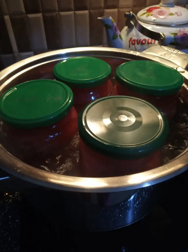 Aslinda cok kolay.domatesleri yikayip uzerlerine kaynar su doktum.5-6 dakika sonra kolayca soyulmaya basliyolar zaten.yikayip kuruladigim kavanozlara soyup ortadan ikiye bolduyum domatesleri basarak dolduruyorum uzerine tuz dokup agzina kapagini baglamadan koyuyorum.tencereye su aliyorum iliklasinca dibine bez koyup kavanozlari yerlestiriyorum.su miktari kavanozun kapagindan 2 parmak asagi olsun ki kaynayinca icine su kacmasin.kaynamaya baslayinca 25 dakika bu sekilde icinde kavanozlari kaynatiyorum.sonra tencerenin altini kapatip kavanozlari bir bir cikarip oylesine koydugum kapaklari iyice sıkıyorum.ve bas asagi bi gece bekletiyorum bu kadar