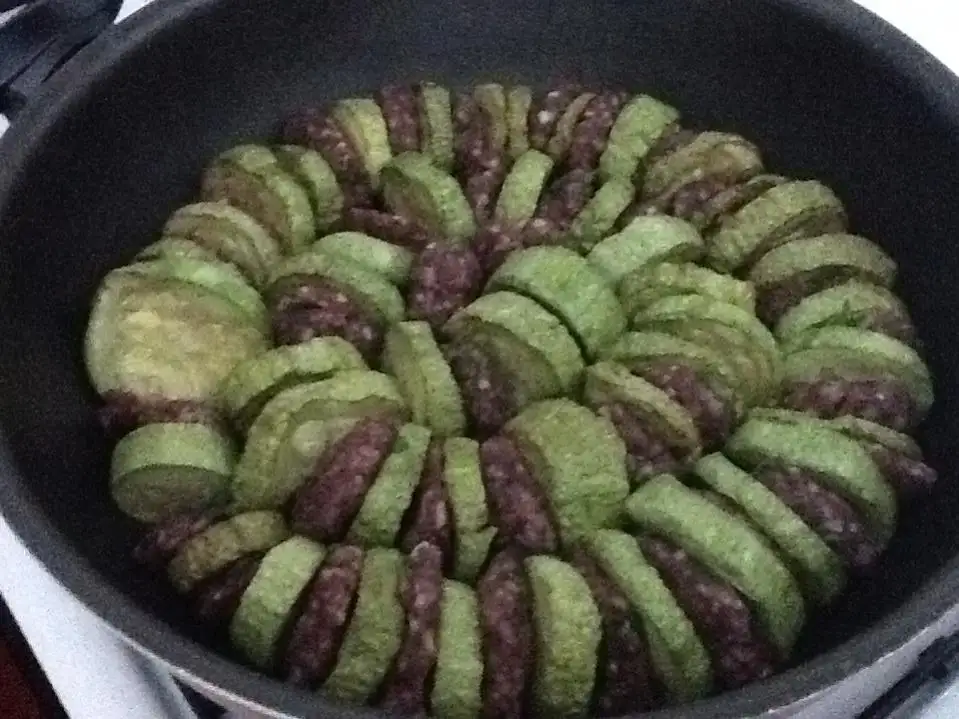 Kabak dizme..Aa henüz pişmedi...Kabaklar şekilde görüldüğü gibi doğuranıp hafif kızartılır.Aralarına dizmek için dana kıymadan bozuk para büyüklüğünde yassı köftecikler hazırlanır.Köfte harcı olarak sadece tuz karabiber ve maydanoz doğradım ben..Şekilde görüldüğü gibi inci gibi dizilirler tencereye