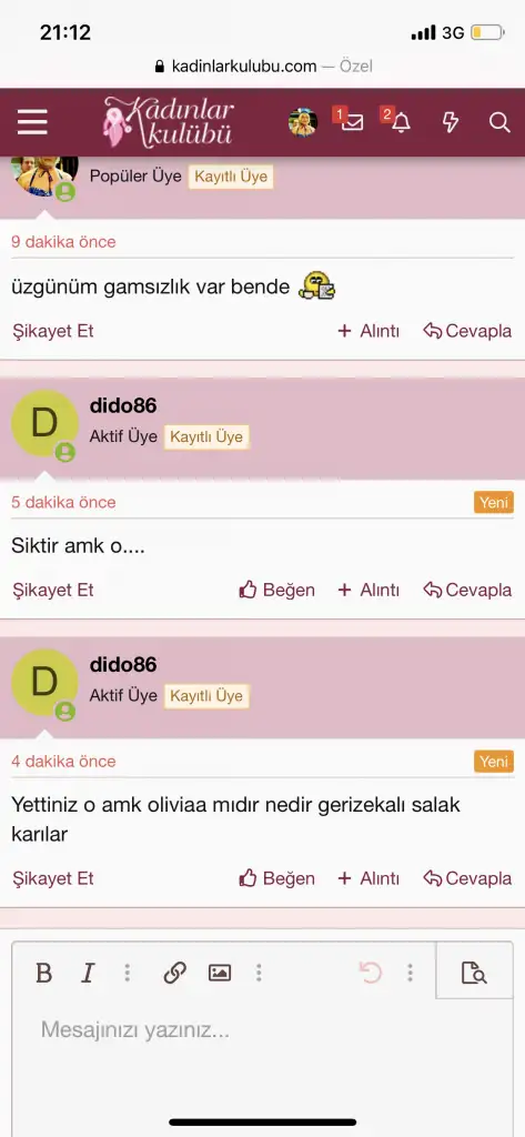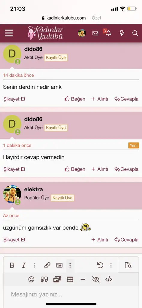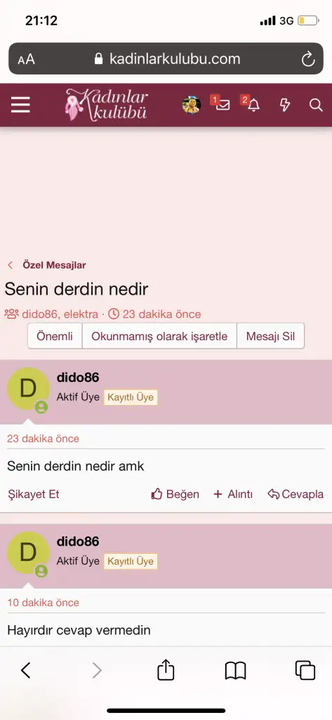 Sabahtan beri sen ve elektra ismindeki arkadaşın bana sürekli özelden mesajlar gönderiyorsunuz ve şikayet ediyosunız ne ailem ne kocam kaldı seni ve elektrayı bu sayfada görmek istemiyorum artıkEe at, ben küfür etmedim hakarette etmedim. Kişi kendinden bilir işi dedim, kötü söz sahibine aittir dedim. Sen bana küçük o... derken ne diyecektim ihihihi diyip gülecek miydim?