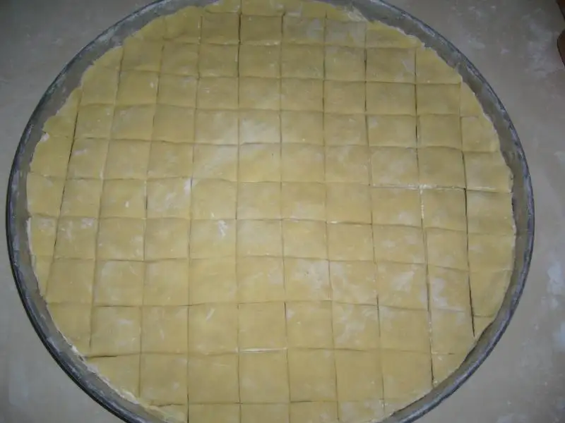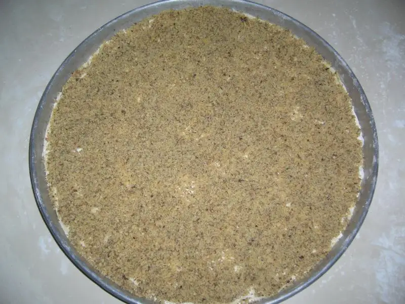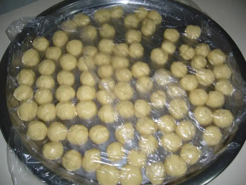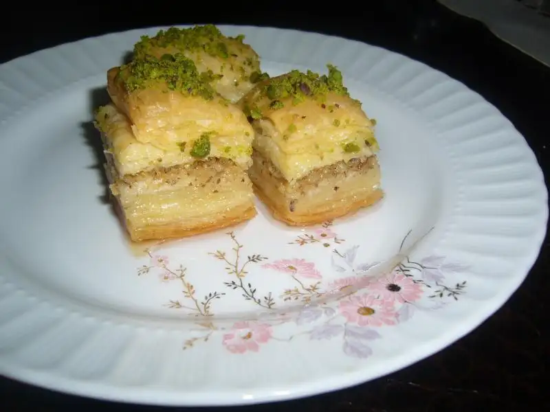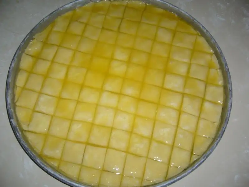 Tüm malzemeler karıştırılır. Hamur yoğrulur.Küçük bezler alınır,40 beze olacak..sonra bezeler 10 ar ,10 ar ayrılır...Her 10 beze tabak büyüklüğünde aralarına nişasta sürülerek açılır.....Sonra tepsi büyüklüğünde büyütülerek tepsiye serilir..Tepsiye büyük gelirse kenarları kesilip içine serilir...2 kat üst üste konulur..Arasına dövülmüş ceviz veyahut dövülmüş antep fıstığı konur.Tekrar 10 ar 10 ar bezeler açılıp,büyütülür...En son kat serilip,istenilen şekilde kesilir..Üzerine 200 gr tuzsuz tereyağı +1su bardağıda sıvıyağ eklenip soğuduktan sonra tepsinin tamamına gelecek şekilde dökülür... 175 derece fırında kızarana kadar pişirilir....Şerbeti kaynatılır..İkiside ılıyınca dökülür....Ve servise hazır Afiyet olsun..Bu tepsi 1.5 ölçüdür.