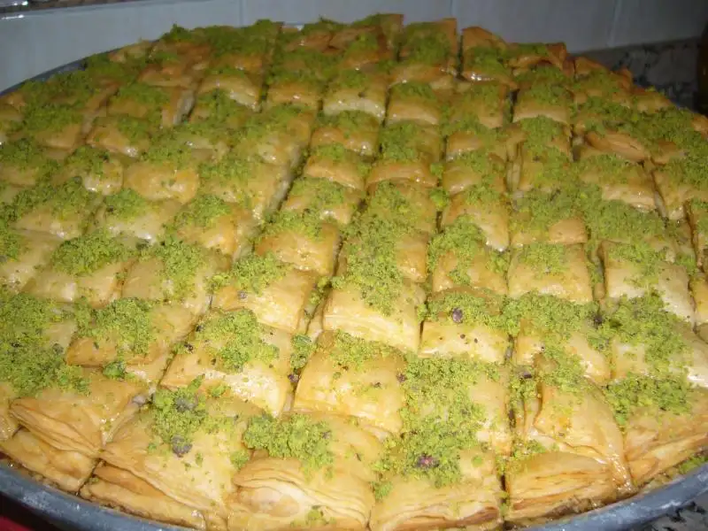 Tüm malzemeler karıştırılır. Hamur yoğrulur.Küçük bezler alınır,40 beze olacak..sonra bezeler 10 ar ,10 ar ayrılır...Her 10 beze tabak büyüklüğünde aralarına nişasta sürülerek açılır.....Sonra tepsi büyüklüğünde büyütülerek tepsiye serilir..Tepsiye büyük gelirse kenarları kesilip içine serilir...2 kat üst üste konulur..Arasına dövülmüş ceviz veyahut dövülmüş antep fıstığı konur.Tekrar 10 ar 10 ar bezeler açılıp,büyütülür...En son kat serilip,istenilen şekilde kesilir..Üzerine 200 gr tuzsuz tereyağı +1su bardağıda sıvıyağ eklenip soğuduktan sonra tepsinin tamamına gelecek şekilde dökülür... 175 derece fırında kızarana kadar pişirilir....Şerbeti kaynatılır..İkiside ılıyınca dökülür....Ve servise hazır Afiyet olsun..Bu tepsi 1.5 ölçüdür.