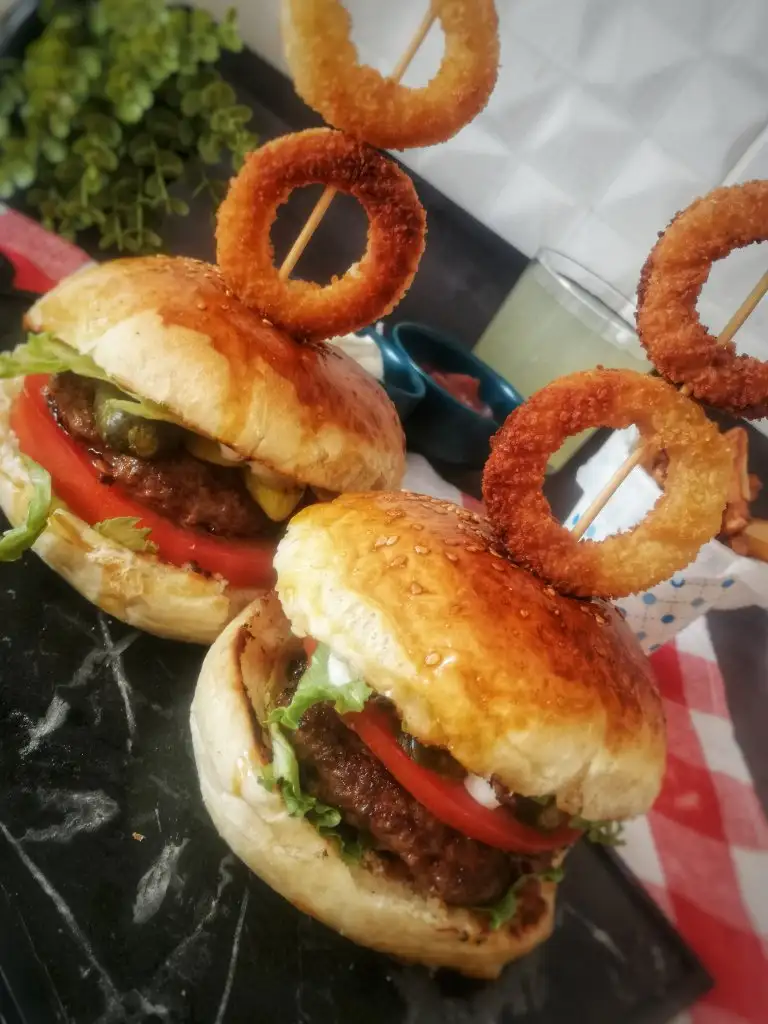Yanında patates kızartması, soğan halkası ve içecek ile servis edelim.