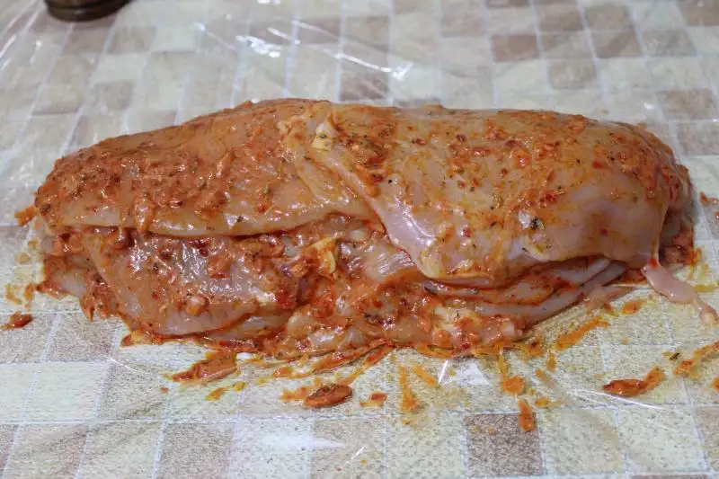 Tavuk göğsünü ince fileto şeklinde kesiyoruz. Diğer malzemeleri bir kapta karıştırıyoruz.