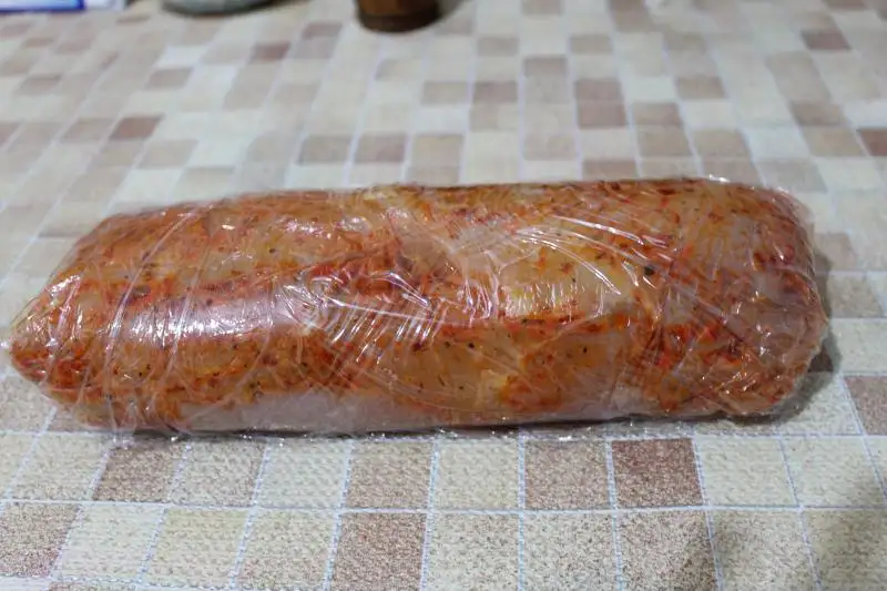 Streç filmin üzerine bir filetoyu koyup, üzerine sosu yayıyoruz. Yine üzerine başka bir fileto koyup bu şekilde devam ediyoruz.